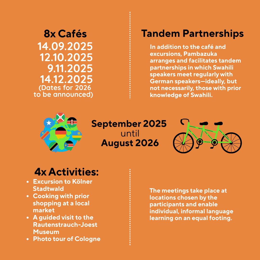 Am 12. Juli 2025 fanden die Feierlichkeiten des International Swahili Day statt, natürlich im Allerweltshaus in Köln-Ehrenfeld. Mehr als 300 Menschen waren anwesend und zelebrierten Swahili-Kultur und -Sprache mittels Film, Musik, Tanz, Akrobatik, Essen und Gemeinschaft. -