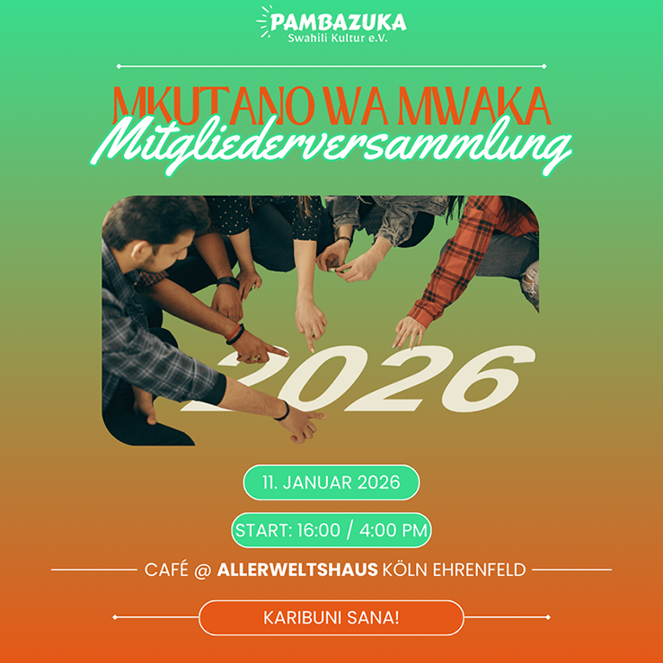 Mnamo Januari 11, 2026, tunawaalika wanachama wote kwa ukarimu kwenye mkutano wetu wa mwaka, ambao – kama ambavyo imekuwa desturi – utafanyika katika Café ya Allerweltshaus. Tunaangalia mafanikio yetu ya mwaka uliopita, 2025, pamoja na kupanga shughuli za mwaka mpya, 2026.